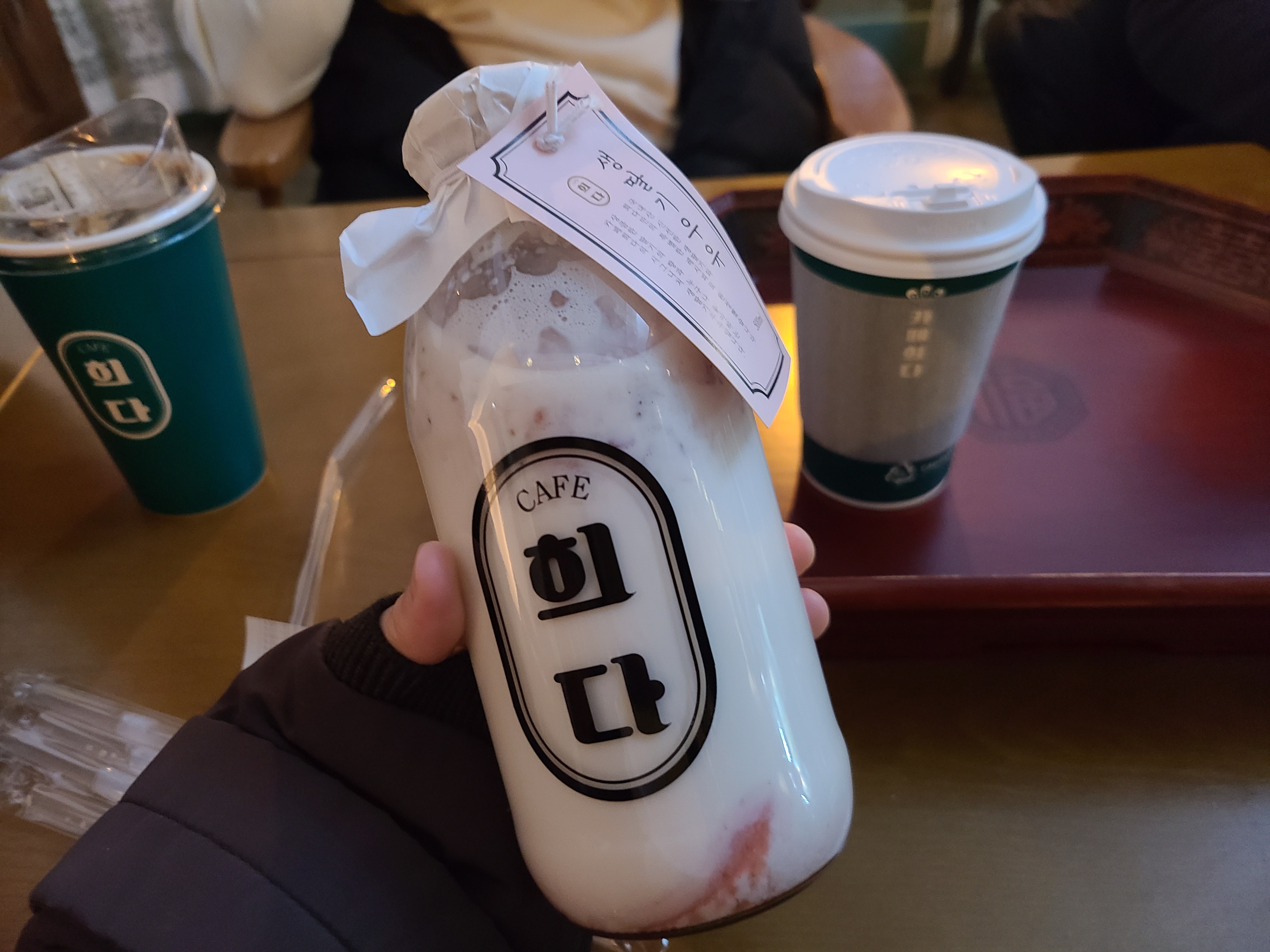열씸히 흔들어서 희다 레트로 컵에 따라 마셨어요 생딸기가 들어있어서 넘넘 맛있었다능